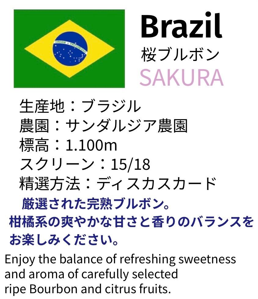 さくらブルボンは、ブラジルのサンタルジア農園などで栽培される、春の桜の季節に届く完熟ブルボン種のコーヒーです。柑橘系の爽やかな甘い香りと、柔らかな甘み、すっきりとした酸味が特徴。